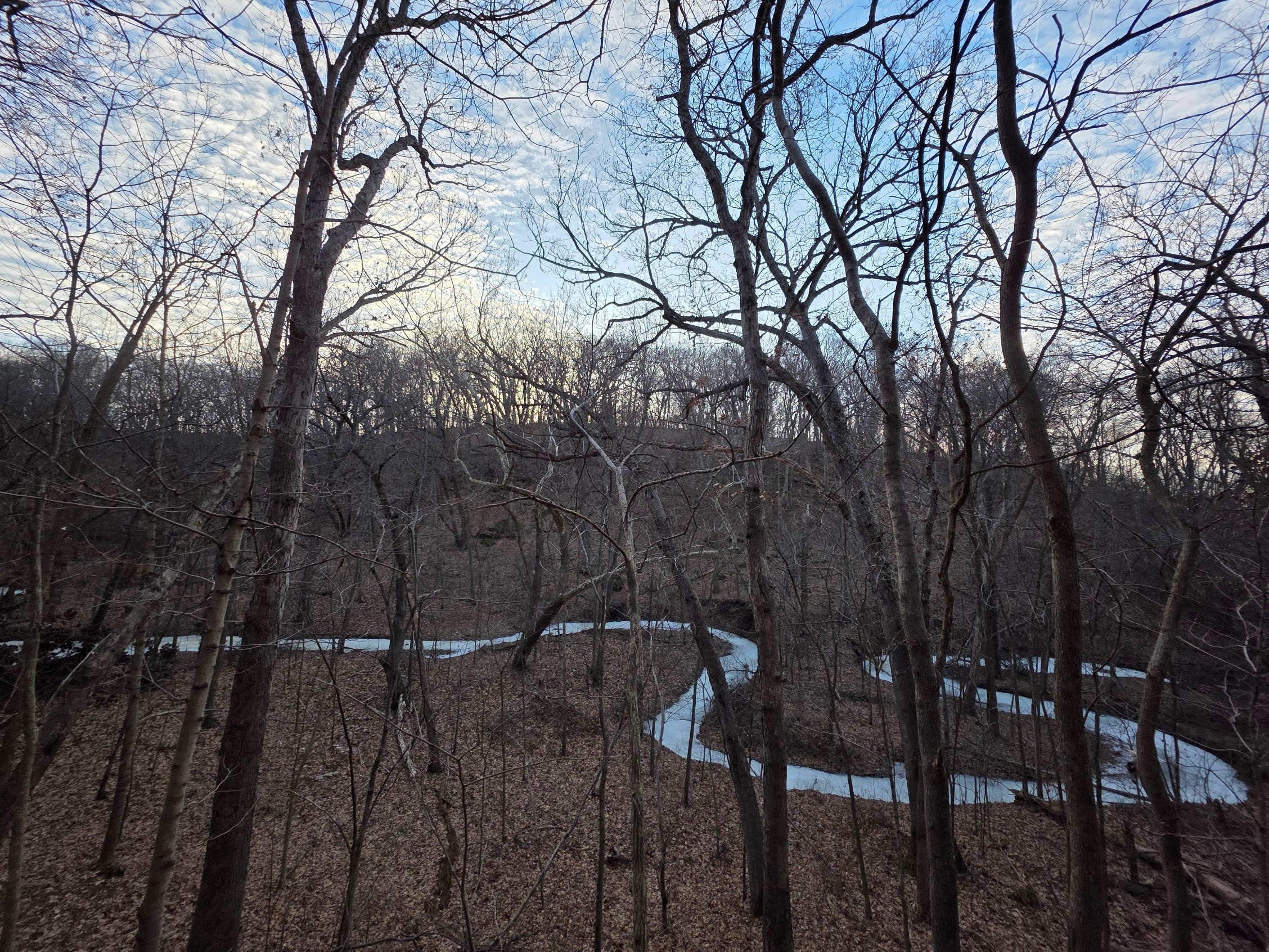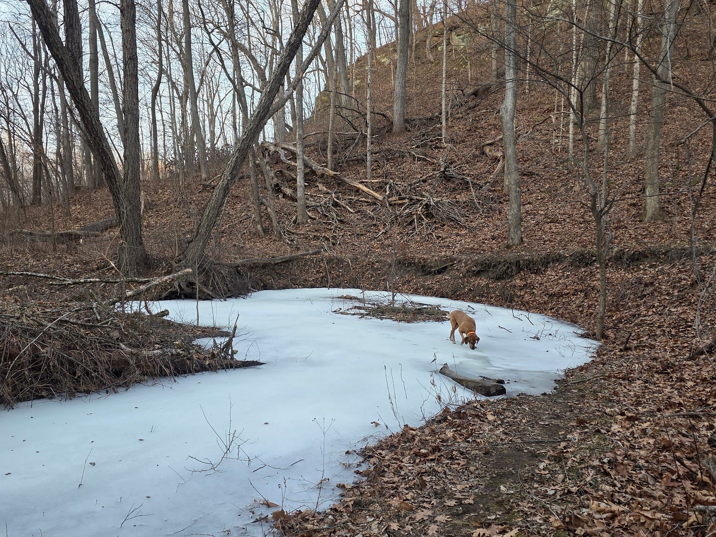 The weather broke yesterday, finally warming up, and Violet the Dog and I headed for the timber. I had to be in Des Moines all day at a conference, and when I left the conference mid-afternoon for home, I was thinking about working on our old house, which we are remodeling to rent out. When I told Annie that, she said something like, “No, you should take Violet to the timber because you are both going crazy.”